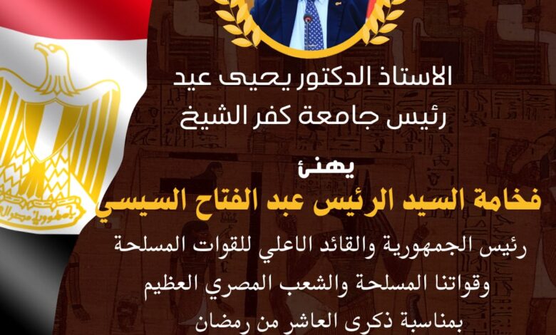 بمناسبة ذكرى العاشر من رمضان، ذكرى النصر الذي ملأ قلوبنا فخراً، أتقدم إليكم بإسمي وبإسم جميع منتسبى جامعة كفرالشيخ من أعضاء هيئة التدريس واداريين وطلاب، بخالص واصدق التهاني والتبريكات .