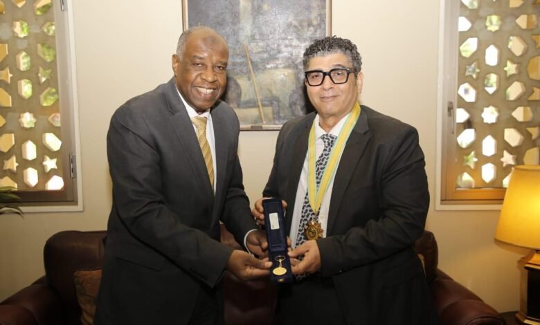تسلم الدكتور علاء عبد السلام رئيس دار الأوبرا المصرية وسام شرف الاتحاد العربى للمحاربين القدماء من اللواء أركان حرب خالد مصطفى توفيق رئيس الإتحاد العربى للمحاربين القدماء .