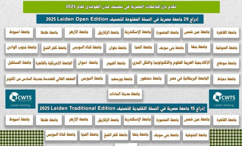 أعلن تصنيف ليدن (CWTS Leiden Ranking) الهولندي نتائجه الجديدة لعام 2025، والتي أظهرت تقدمًا ملحوظًا للجامعات المصرية، وذلك في إطار التقدم المستمر الذي تُحققه الجامعات المصرية في مختلف التصنيفات الدولية المرموقة.