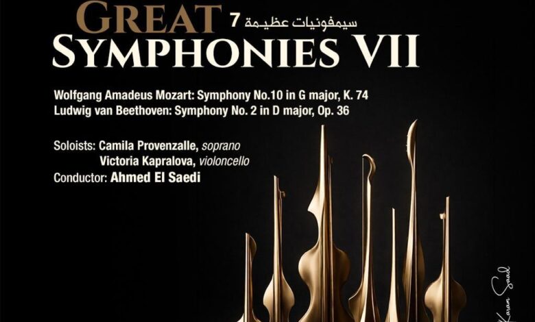 تنظم دار الأوبرا المصرية لأوركسترا القاهرة السيمفونى ويقودها المايسترو أحمد الصعيدى ويشارك خلالها السوبرانو البرازيلية كاميلا بروفنزالى وعازفة التشيللو الروسية فيكتوريا كابرالوفا وتقام فى السابعة والنصف مساء السبت ٢٥ أبريل على المسرح الكبير وتضم عملين من أهم المؤلفات فى تاريخ الموسيقى الكلاسيكية هما السيمفونية العاشرة لـ فولفجانج أماديوس موتسارت والسيمفونية الثانية لـ لودفيج فان بيتهوفن .