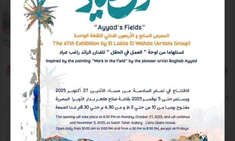 تستضيف دار الأوبرا المصرية برئاسة الدكتور علاء عبد السلام المعرض السابع والأربعون لمجموعة فنانى اللقطة الواحدة بعنوان “حقول عياد” استلهاما من لوحة ” العمل فى الحقل” للفنان الرائد راغب عياد ويفتتح فى السادسة مساء الأثنين 27 أکتوبر بقاعة صلاح طاهر للفنون التشكيلية .
