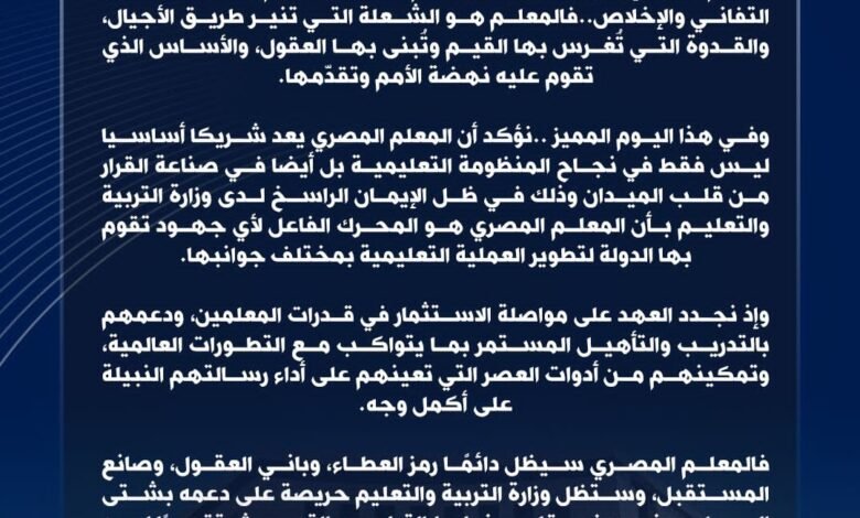 فالمعلم المصري سيظل دائمًا رمز العطاء، وباني العقول، وصانع المستقبل، وستظل وزارة التربية والتعليم حريصة على دعمه بشتى السبل ووضعه في قلب خطط التطوير والتحديث؛ تقديرًا لدوره المحوري في بناء الإنسان المصري وصياغة وعي الأجيال القادمة.