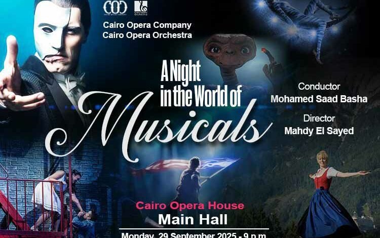 تقيم دار الأوبرا المصرية برئاسة الدكتور علاء عبد السلام حفلاً بعنوان ليلة فى عالم الميوزيكال لفرقة أوبرا القاهرة بمصاحبة أوركسترا أوبرا القاهرة بقيادة المايسترو محمد سعد باشا ومن إخراج مهدى السيد وذلك فى التاسعة مساء الأثنين 29 سبتمبر على المسرح الكبير يأتى على أجندة فعاليات وزارة الثقافة الخاصة بعرض اشكال الإبداع العالمى للجمهور .