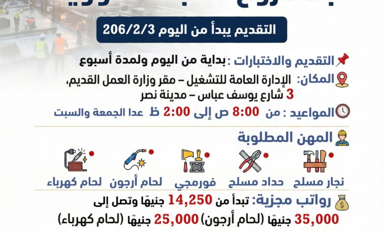 وأوضح الوزير أن التقديم يوميًا عن طريق الرابط السابق أو التوجه إلى مقر الإدارة العامة للتشغيل بمقر وزارة العمل القديم ، الكائن 3 شارع يوسف عباس – مدينة نصر، من الساعة الثامنة صباحًا وحتى الثانية ظهرًا،ما عدا الجمعة والسبت، داعيًا الشباب من أصحاب الخبرات والمهارات الفنية إلى سرعة التقدم والاستفادة من هذه الفرص الواعدة داخل أحد أكبر المشروعات القومية…وذكر بيان الوزارة أن الوظائف المطلوبة تشمل عددًا من التخصصات الفنية الأساسية، وهي: نجار مسلح، حداد مسلح، فورمجي، لحام أرجون، ولحام كهرباء، وهي مهن تمثل ركيزة أساسية في مراحل تنفيذ المشروع.